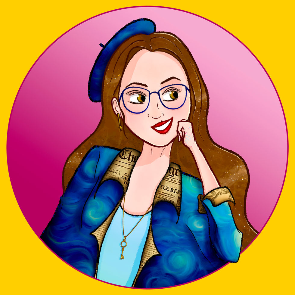 This digital self-portrait captures the artist in a stylized, storybook-inspired style, blending personality, creativity, and visual storytelling into one charming illustration. Dressed in a deep blue coat adorned with Van Gogh–like swirling patterns and layered over vintage newspaper textures, the look reflects a love for art, history, and narrative depth.