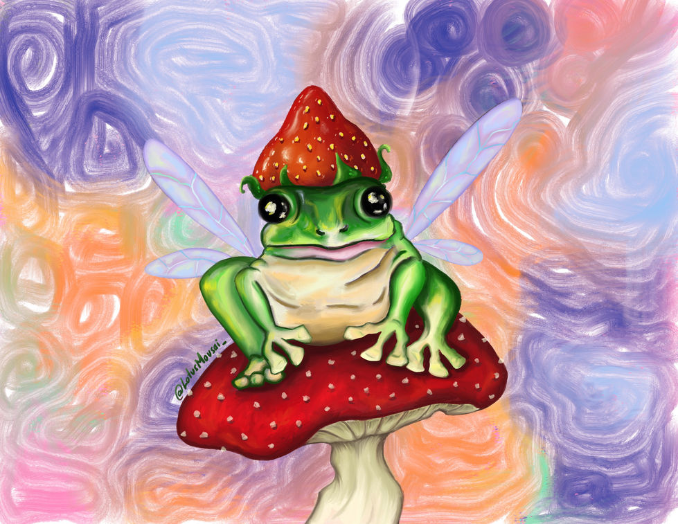 This colorful 2D illustration features a charming frog character standing proudly atop a giant mushroom, wearing an adorable strawberry hat. The piece embraces a whimsical and playful aesthetic, bursting with vibrant colors, soft textures, and fantastical details that bring the scene to life.